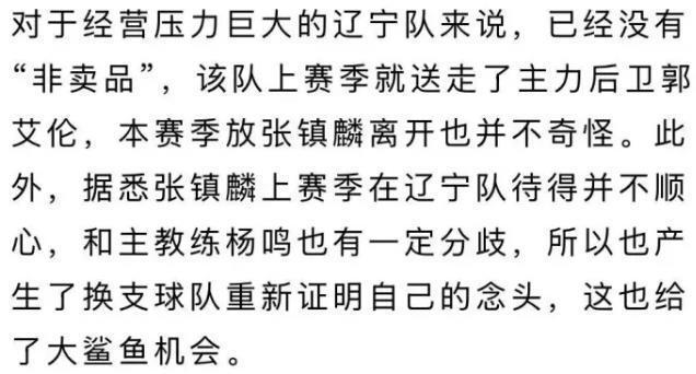 摘自上海新民晚报文章内容,“对于经营压力巨大的辽宁队来说,已经没有“非卖品”,该队上赛季就送走了主力后卫郭艾伦,本赛季放张镇麟离开也并不奇怪。此外,据悉张镇麟上赛季在辽宁队待得并不顺心,和主教练杨鸣也有一定分歧,所以也产生了换支球队重新证明自己的念头,这也给了大鲨鱼机会。”