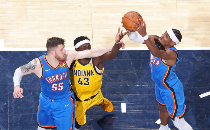 步行者近来的问题在于节奏放缓(哈利伯顿右腿爆发力不足),不得不陷入半场进攻,而这时雷霆联盟第一的防守就会变得密不透风。