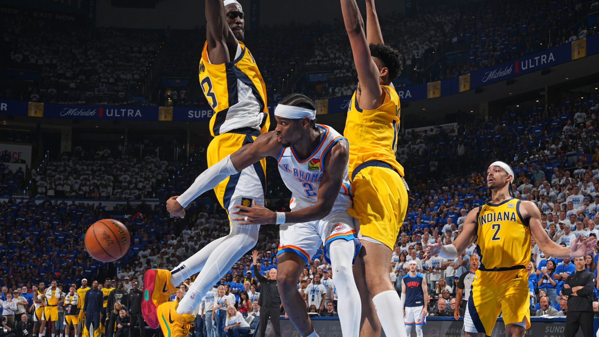 雷霆在第五战的40个运动战进球中有24次助攻,但他们在步行者主场的两场比赛里,74个进球只有27次助攻。总决赛至今,雷霆的整体转移球表现下滑——场均传球216次,比68胜的常规赛减少约25%,部分原因显然是面对主场作战的对手时,对方防守压迫性更强。